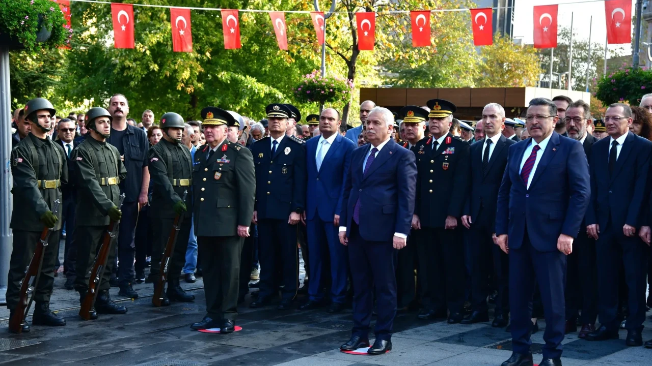15 Temmuz Şehitler ve Hürriyet Parkı’nda gerçekleştirilen törende, Atatürk Anıtı’na çelenk sunulmasının ardından saygı duruşunda bulunuldu. İstiklal Marşı’nın okunmasıyla birlikte Türk bayrağı göndere çekilerek yarıya indirildi.